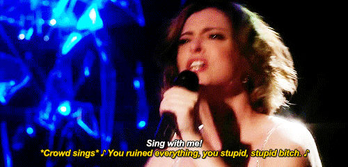 Rebecca sings this to herself. At herself. In a mirror.